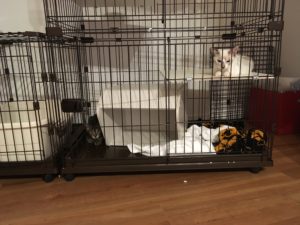 まず、朝起きると大変なことが。ケージの中段に置いていたスタックボックスがひっくり返って下段に落下していたのです!